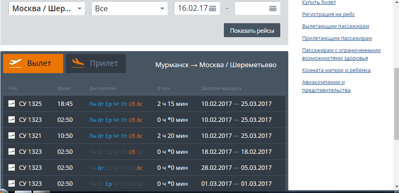 А вот от Мурманска есть регулярные рейсы до Москвы, и я сразу приведу расписание, к примеру, на 16 февраля будет 2 рейса: