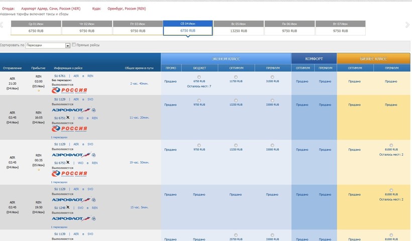 Я всегда была приверженкой перелётов на самолёте, так как это наиболее быстрый вариант преодолеть расстояние между двумя городами. Тем более, в данном случае между Сочи и Оренбургом большое расстояние, между ними 2213 километров и такое расстояние проще всего преодолеть на самолёте, а не на машине или автобусе. Я не сомневалась и выбрала самолёт. В пути в самолёте я провела совсем не так много времени, всего два с половиной часа. С покупкой билетов мне очень повезло и я взяла билет на рейс берез пересадки, ищите такие рейсы, так как, если Вы полетите на рейсе с пересадкой, то в пути проведёте не меньше 11 часов, а заплатите точно такие же деньги за билет. На скриншоте Вы можете увидеть возможные рейсы, я взяла билет на тот же рейс, что указан в списке, только на другую дату, ниже Вы можете видеть рейсы с пересадками, время в пути и стоимость свободных билетов.