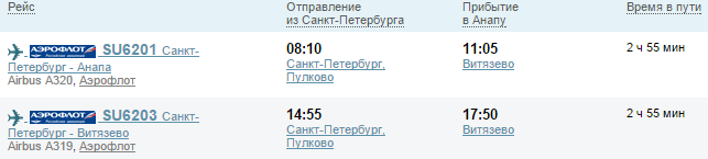 Из Санкт-Петербурга в Анапу летает два самолета компании Аэрофлот, которые отправляются из аэропорта Пулково и прибывают в аэропорт Витязево.