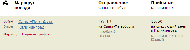 РЖД предлагает своим пассажирам только один удобный поезд 079Ч Санкт-Петербург → Калининград, который отправляется с Витебского вокзала в 16:13 и прибывает в 15:50 на следующий день в Калининград.
