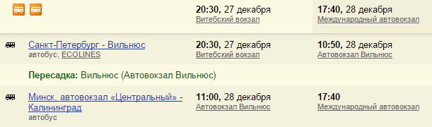 Путешествуя из Санкт-Петербурга в Калининград, можно делать пересадку в Минске, Риге и других европейских городах. Для меня самым удобным вариантом является поездка с пересадкой в Вильнюсе, поскольку ждать следующего автобуса придется 10 минут и в дороге всего 21 час.
