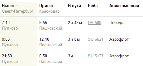 По данному маршруту есть несколько прямых рейсов, вылетающих из петербургского аэропорта Пулково и прибывают в Краснодар в аэропорт Пашковский.