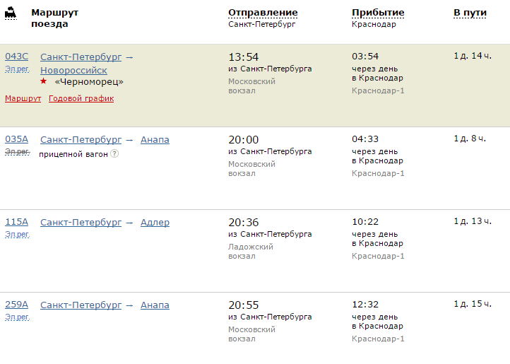 По маршруту Санкт-Петербург - Краснодар курсирует четыре поезда, отправление которых происходит: трех поездов с Московского железнодорожного вокзала и одного поезда с Ладожского вокзала. Учитывайте этот нюанс при поездке и не путайте адрес отправки.
