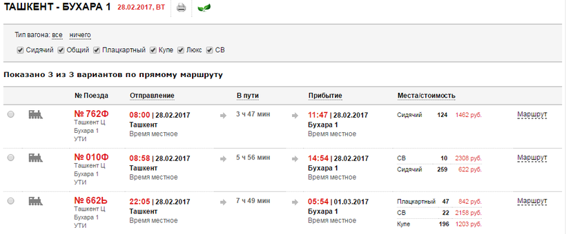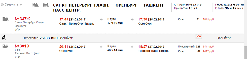 Итак, я взяла расписание на 23 февраля и сразу показываю, что будет один дневной рейс до Ташкента в 17:45. Обратите внимание, что прийти вам надо на Главный железнодорожный вокзал, но самое главное, что до Ташкента так же ехать с пересадкой и будет она в Оренбурге. Прибудете на вокзал этого города ровно через 2 суток. В Оренбурге один вокзал и не придется делать пересадку, а всего лишь подождать 2 часа 38 минут пока не отправиться ваш следующий рейс до в 20:13. Примерно столько же ехать и до Ташкентского вокзала, а вот от него уже можно напрямую доехать до Бухары. Поскольку в дороге вы проведете 4 дня, то следующее расписание я покажу уже на 28 число. А будет целых 3 рейса: