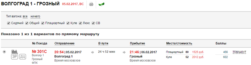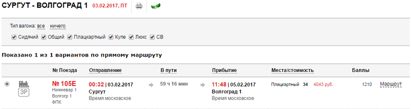 Итак, давайте рассмотрим вариант с Волгоградом. В качестве примера я беру завтрашний день и на него есть всего лишь один рейс из вокзала Сургута в 00:32. Прибудете вы на вокзал «Волгоград 1» и придется чуток подождать, чтобы сесть на следующий поезд до Грозного. Кстати, ехать придется 2 дня 11 часов.