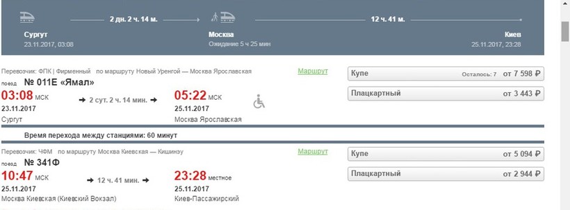 Хорошо, что хотя бы остались железнодорожные рейсы между двумя странами, это позволяет иметь хоть какую-то альтернативу перелету. Однако из Сургута надо доехать до Москвы, а там уже будет состав на Киев. В столицу поезда идут ежедневно по несколько раз в день (03:08, 08:33, 10:13) и думаю, что с посадкой у вас проблем не возникнет. Дорога занимает 2 дня 2 часа, а далее вам придется потерпеть еще 13 часов, чтобы наконец-то прибыть в столицу Украины. На сайте РЖД вы можете уточнить время отправки поезда на любой день недели.