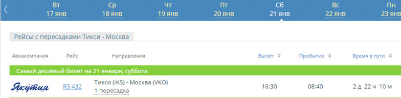 Стоит подметить, что лететь придется с пересадкой в Якутии. Если суммировать время, то придется потратить на дорогу 2 дня 22 часа, в то время как из Москвы в Тикси лететь 13 часов 30 минут. Самолеты приземляются в аэропорту Внуково.