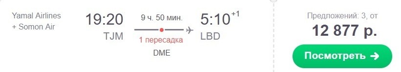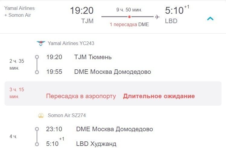 На дорогу уйдет десять часов. Рейсы выполняют данные компании: Yamal Airlines и Somon Air. Аэропорт пересадки — Домодедово.