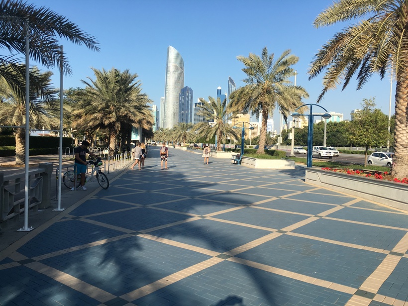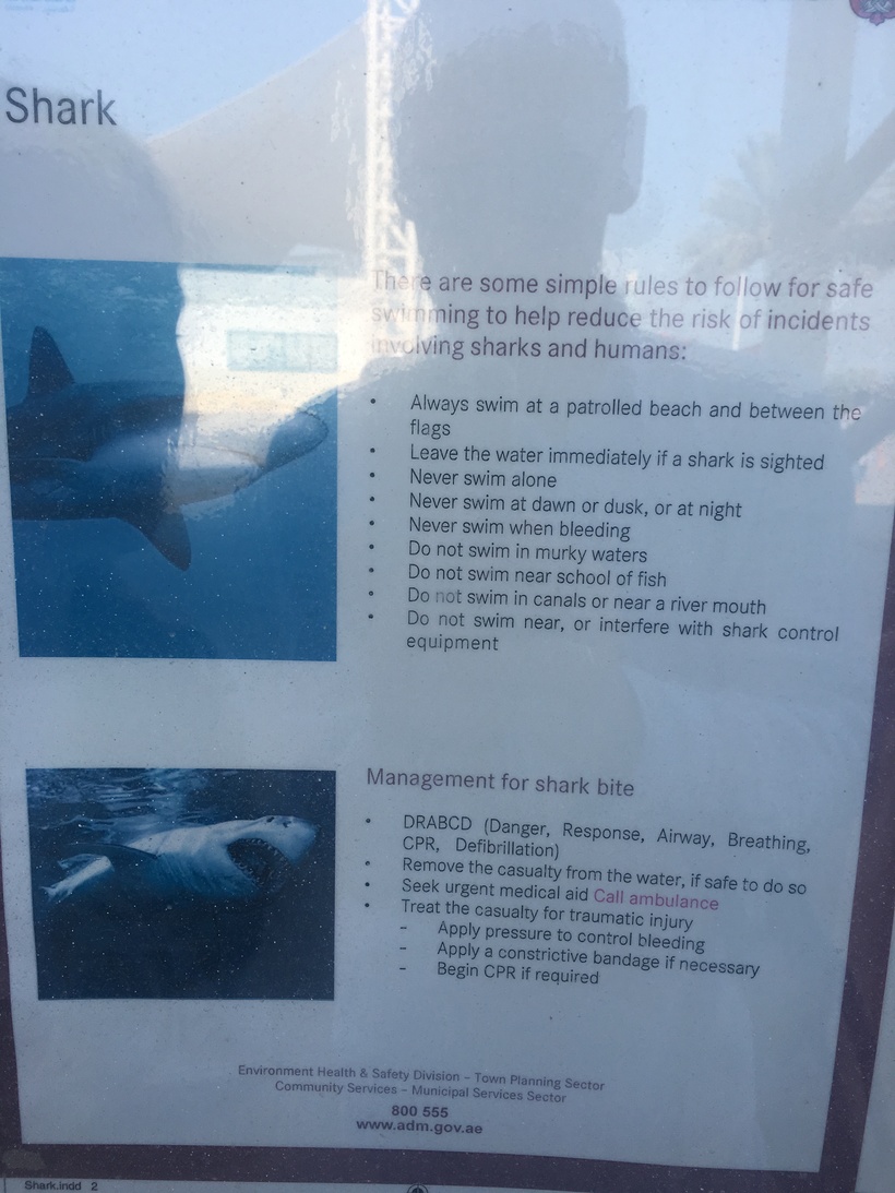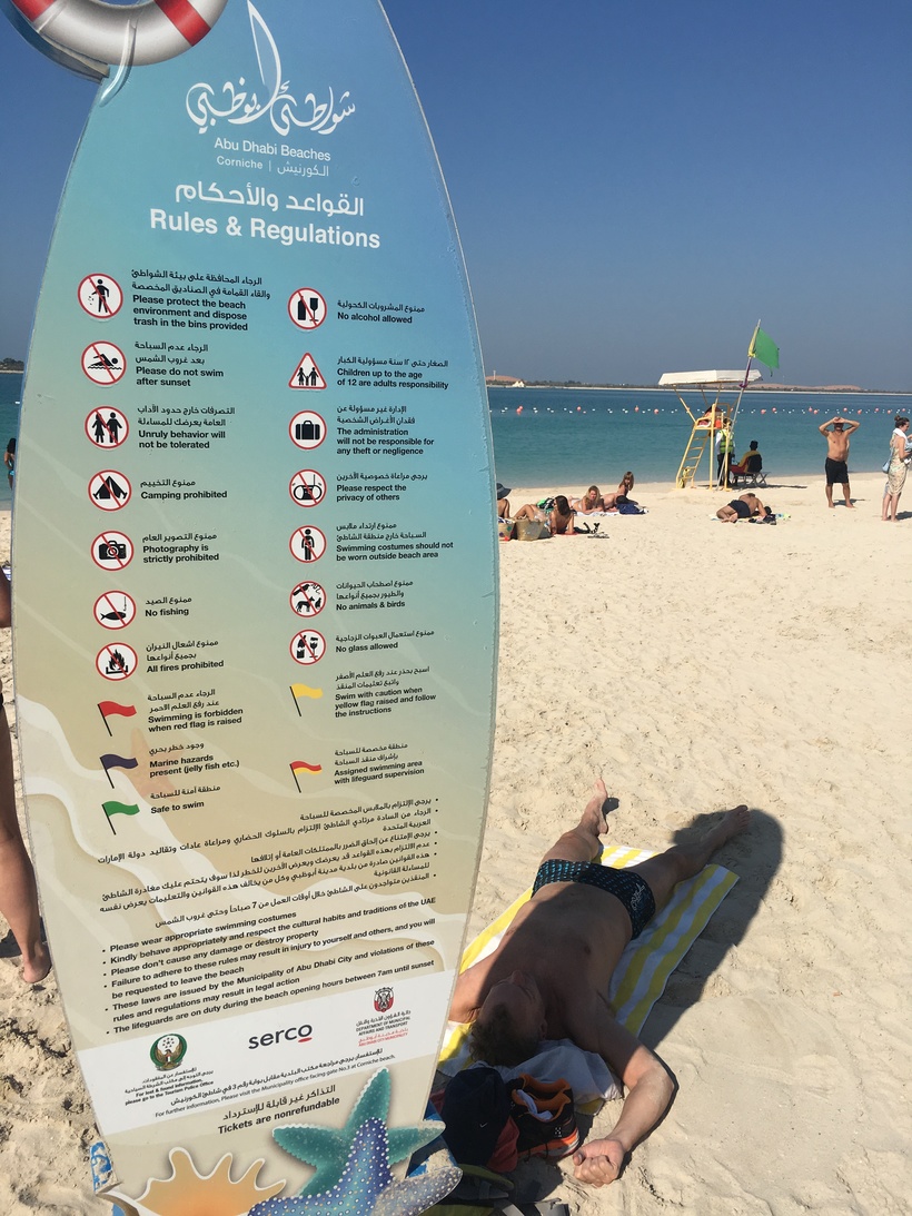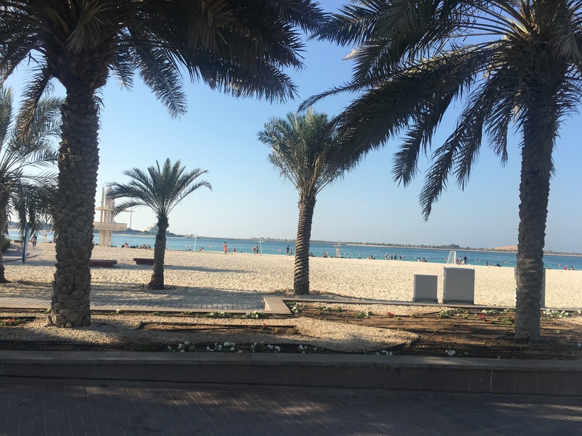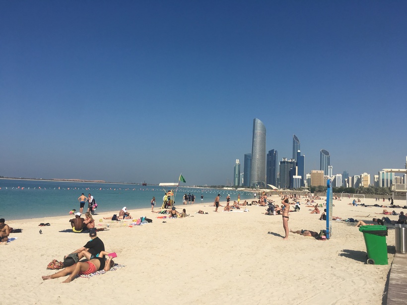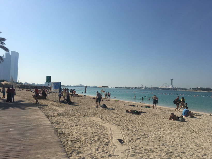 Пляжи Абу-Даби бич. Корниш. Это центральный пляж города рядом с набережной. Мы были там 2.01. Народу было очень мало. То ли вода холодная, то ли акулы приплыли))). Шучу конечно, но на информационных щитах они были указаны как возможная опасность. Вход на пляж бесплатный, есть несколько кафе рядом.