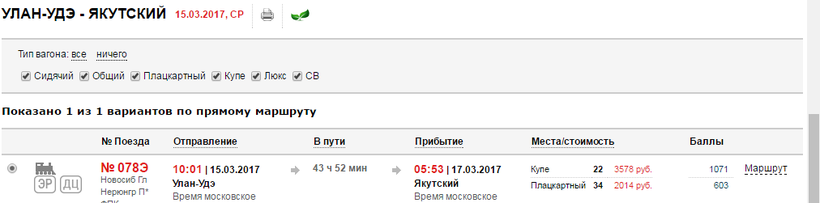 В Якутск вы прибудете на железнодорожную станцию «Якутский» дальневосточного направления. И сразу же хочу вам показать расписание, к примеру, на 15 число этого месяца. Будет всего лишь один утренний рейс в 10:01 и что самое главное, рейсы есть не ежедневно, а несколько раз в неделю. Перед тем как ехать обязательно хорошо изучите расписание на сайте РЖД. Большого комфорта не ждите, так как составы старые и, как правило, это поезда из Новосибирска, которые следуют до Нерюнгри.