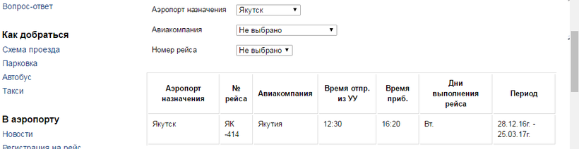 Прошу вас заметить, что на сайте пока что висит сезонное расписание с 28.12.2016 по 25.03.2017. Расписание потом изменится (будет летнее), но вы не волнуйтесь, так как его можно посмотреть на сайте. Получается, что рейсы есть только по вторникам в 12:30, а вот прибывает самолет в аэропорт Якутска в 16:20.
