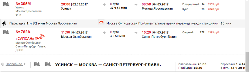 Наиболее удобным вариантом будет пересадка в Москве, так как здесь играет роль расстояние и время. К примеру, до Москвы ехать 1 день 15 часов, а вот от столицы до Питера 4-8 часов, в то время как до Сыктывкара ехать чуть меньше суток, а от него до Питера 1 день 10 часов. Чтобы вы сами убедились в моих словах, я сразу прикреплю расписание, а возьму для примера 2 марта. Итак, в этот день будет два рейса до Москвы в 20:00 и один до Сыктывкара в 08:00.  Железнодорожный вокзал Усинска находится по адресу: ул. Железнодорожная, 1.
