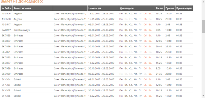 А вот из Москвы до Питера рейсы есть часто, я сразу же прикреплю расписание, чтобы вы видели, что вылеты есть практически ежедневно, но только от разных авиакомпаний. Лететь по времени 1 час 30 минут, и вы будете в Пулково.