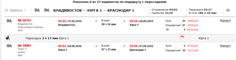 Не стоит не брать в расчёт этот вариант, так как он может быть альтернативой самолёту, альтернативой хотя бы по стоимости путешествия, ведь, поездка на поезде будет во много раз дешевле, чем перелёт, хоть и гораздо длиннее по времени. Если Вы никуда не торопитесь и хотите сэкономить, то не раздумывая отправляйтесь из Владивостока в Краснодар поездом. В пути Вы проведёте 186 часов и будете ехать с пересадкой, это не очень удобно, конечно, но такой вариант существует. Первый поезд Владивосток – Юрга, идёт в пути 96 часов, второй поезд Юрга – Краснодар идёт в пути 87 часов. Если будете брать билеты заранее, то вполне возможно найдёте маршрут без пересадок.
