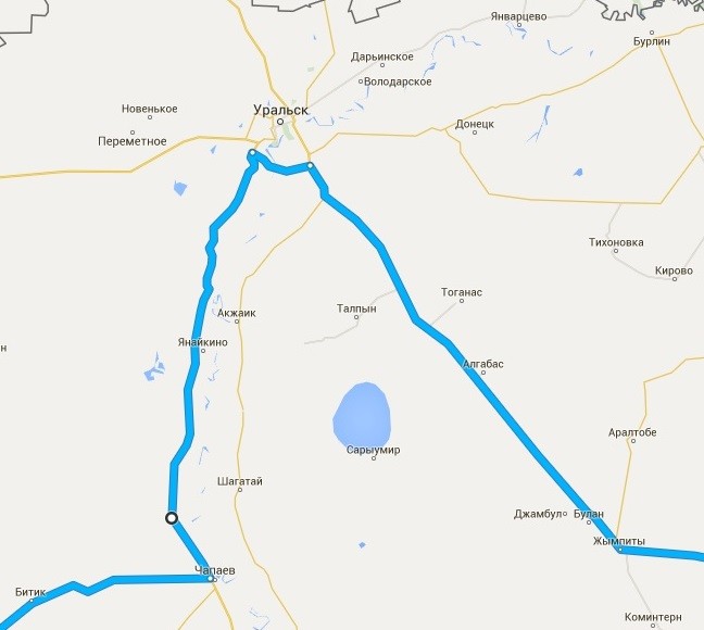 Маршрут идет через Караоба, Казталовку, на Чапаев. Дороги, соединяющей Чапаев с Жымпиты, не существует. Поэтом приходится делать 260-километровый крюк на Уральск.