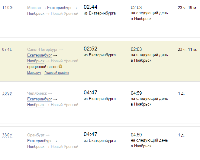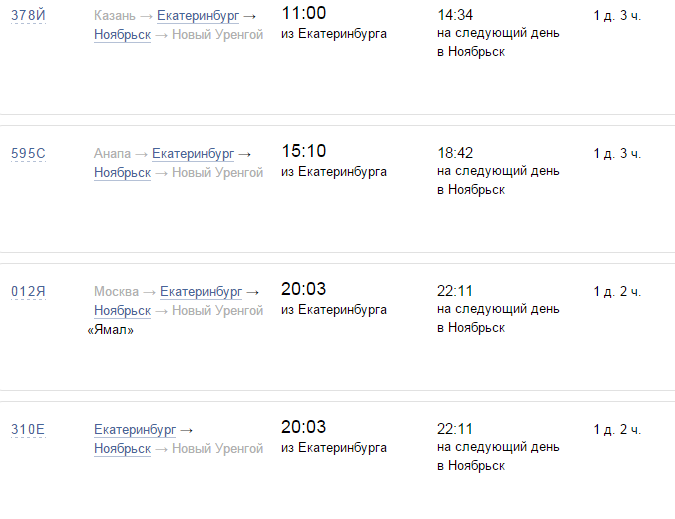Маршрут Екатеринбург - Ноябрьск обслуживает около семи поездов, которые чередуются по дням: