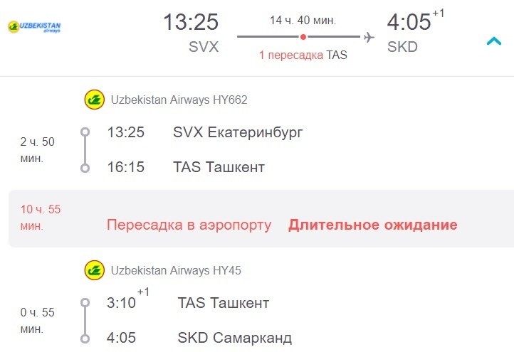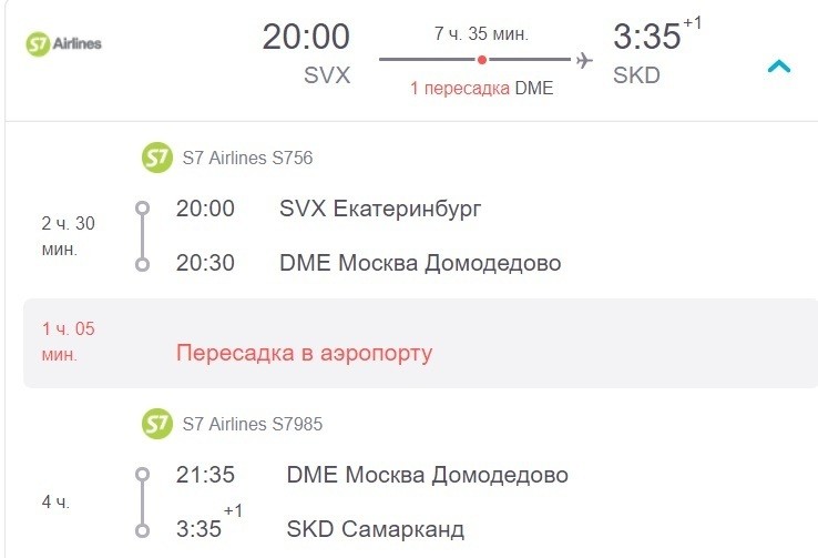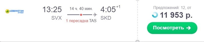 Оба рейса выполняет компания S7. Также по четвергам из Екатеринбурга можно добраться до Самарканда с пересадкой в столице Узбекистана — Ташкенте. Оба рейса выполняет Uzbekistan Airways.