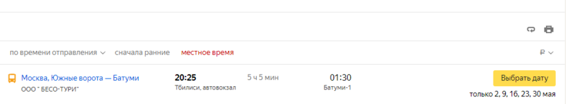 - выезд по средам и субботам из Адлера в 09:30 и прибытие в Тбилиси 01:30 ночи.