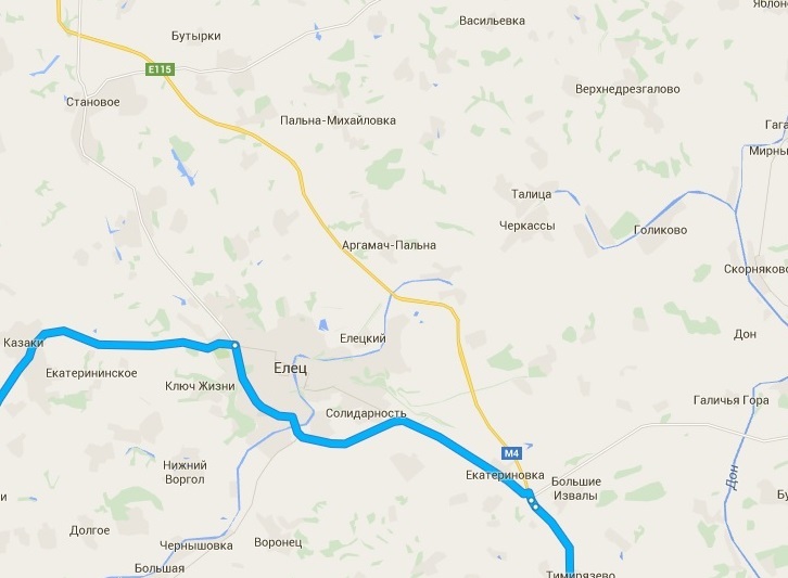 Место ночевки описал выше. Утром иду традиционным маршрутом – по М4. Правда, через 110 километров, под Екатериновкой, будет развилка – следует брать левее, на Елец. Вот ситуация на карте.