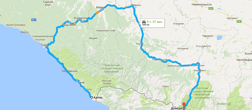 Расстояние между Адлером и Домбаем составляет 139 километров или 86 миль по прямой и 584 километра или 363 мили по автодорогам.