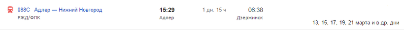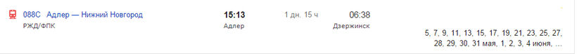 Зимой передвигаться на автомобиле я не рискнула и отправилась в путь на поезде. С конца мая по октябрь рейс «Адлер - Нижний Новгород», на котором можно доехать до Дзержинска, вообще ходит ежедневно. В остальные месяцы он отправляется по нечетным числам. Для вашего удобства расписание этого поезда привожу ниже.