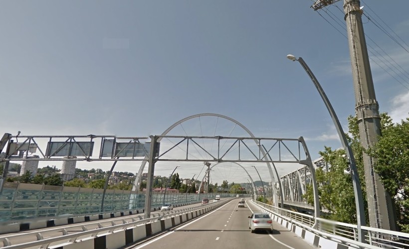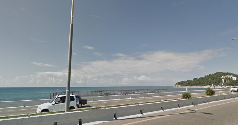 Оно будет слева еще 150 километров. Доедем и до мыса, виднеющегося вдали. В районе Малого Ахуна берем правее, что пройти через Сочи. Море пропадает, чтобы вернуться в Лоо. Вот оригинальный мост через речку Сочи. «Кривые конструкции» - не оптическое искажение, а дизайнерское решение.