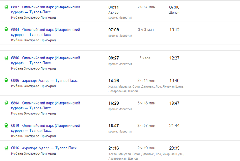 Больше всего мне понравилось добираться из Адлера в Шепси на электричках. Отправляются они от аэропорта и Имеретинского курорта с 04:11 до 21:16, а ехать нужно в среднем 2,5-3 часа.