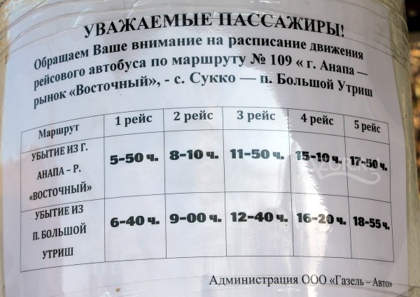 Кроме рейсового автобуса, по этому же маршруту ходит и обычная маршрутка, так же под номером 109. Ее маршрут следующий: ТРЦ "Красная площадь" - улица Стаханова - улица Парковая - улица Крестьянская - улица Крымская - улица Астраханская (туда) - улица Ленина (обратно) - Супсехское шоссе - Супсех - Варваровка - Большой Утриш, поэтому подсесть на нее можно на любой, удобной для вас остановке.