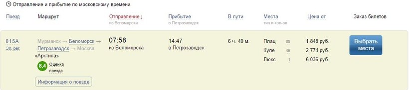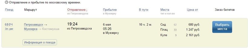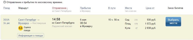 - Поезд Санкт-Петербург — Муезерка №350А, отправление в 14:58, с Ладожского вокзала, прибытие в 06:54ч. Время в пути 15:56 минут. Поезд пассажирский, вагоны обычные, старые, био-туалетов нет, комфортабельность средняя, мало убирались в вагоне, из окон дует, много небольших остановок во время следования.