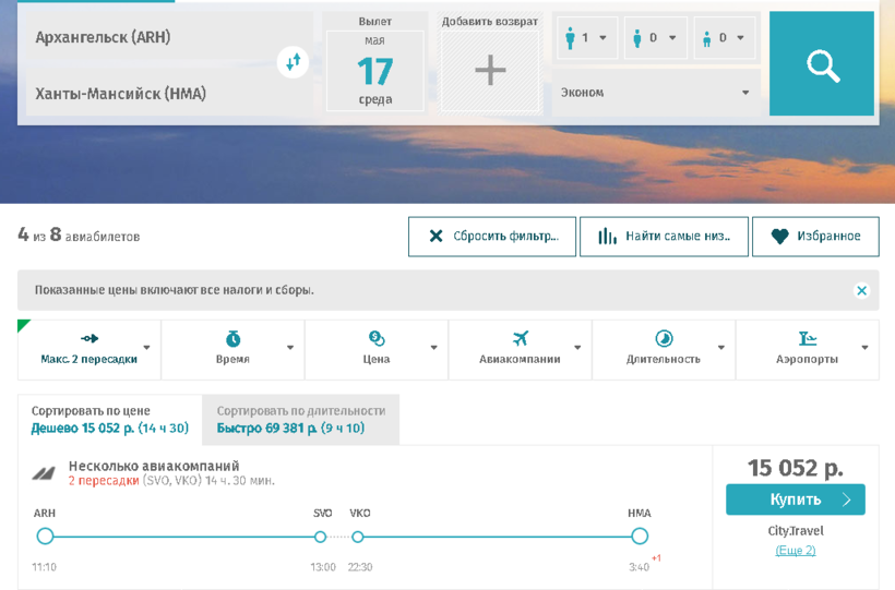 При полете же из Архангельска в Ханты-Мансийск также рекомендую ориентироваться в основном на рейсы с 1 пересадкой для экономии собственного времени. Например, в Москве или в Тюмени.