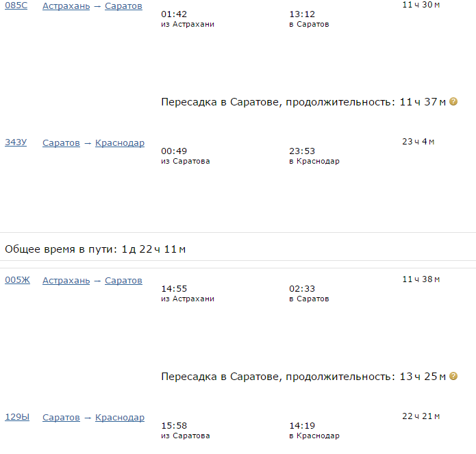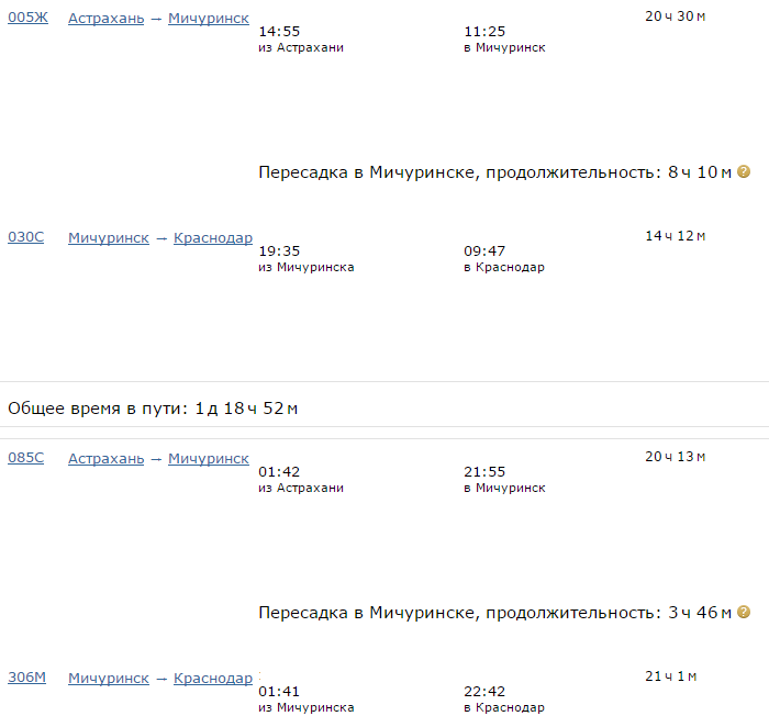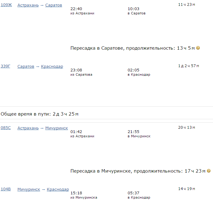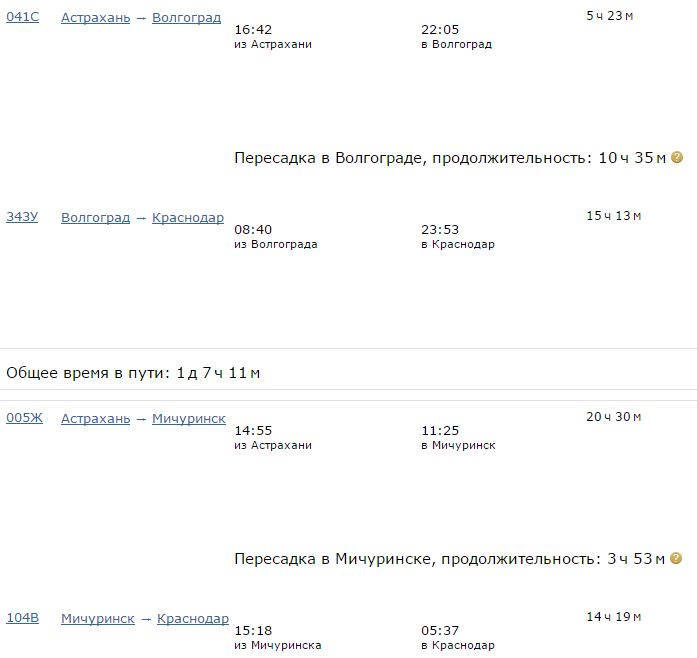 РЖД предлагает нам несколько вариантов проезда по данному направлению с пересадками в Мичуринске, Волгограде, Саратове. В дороге вы проведете от одних суток до двух, в зависимости от выбранных поездов.