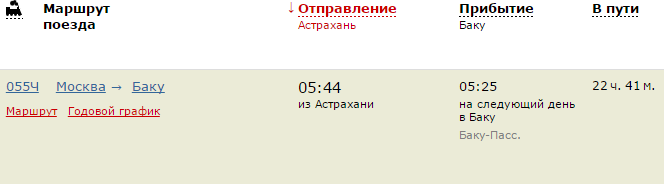 055Ч - Москва → Баку, отправление из Астрахани в 05.44, прибытие на главный железнодорожный вокзал Баку - Пассажирский в 05.25 следующего дня.