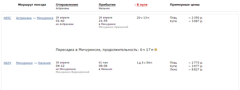 Прямого железнодорожного сообщения между Астраханью и Нальчиком нет, в любом случае придется делать в Мичуринске.