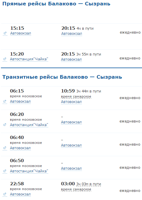 Первый рейс в 15.15 с главного автовокзала, другой - в 15.20 с автовокзала "Чайка". Прибывают они в Сызрань одновременно - в 20.15.