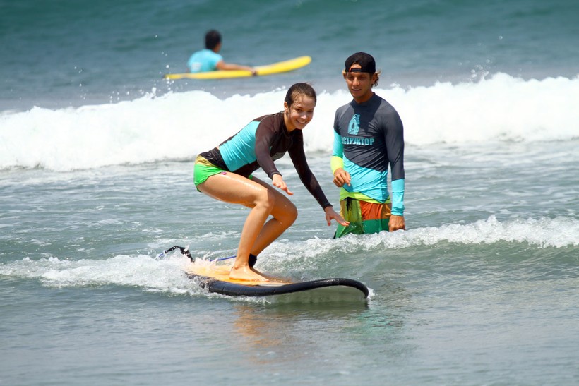 - Во-первых, серфинг! Ну невозможно побывать на Бали и попробовать хоть раз встать на доску. Уверяю, это не так уж и сложно, вам понравится! Веселье точно получите. Урок с инструктором (местным жителем) будет стоить от 5$ (не забывайте торговаться, на пляже вам сначала скажут цену больше, но вы потихоньку снижайте!