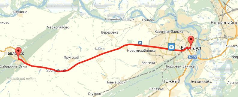 56 километров по хорошей автодороге регионального значения Р-382 преодолевается за 40-50 минут. От центра Барнаула надо ехать через Индустриальный район, в западном направлении, мимо аэропорта. На это понадобится 4 литра бензина на 150 рублей.