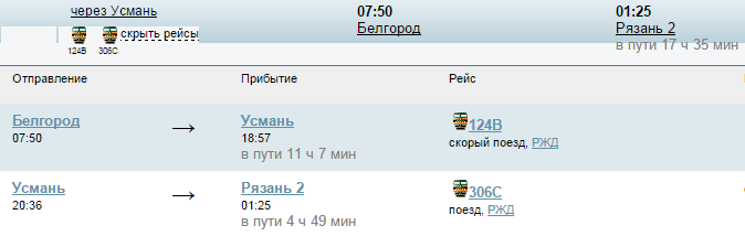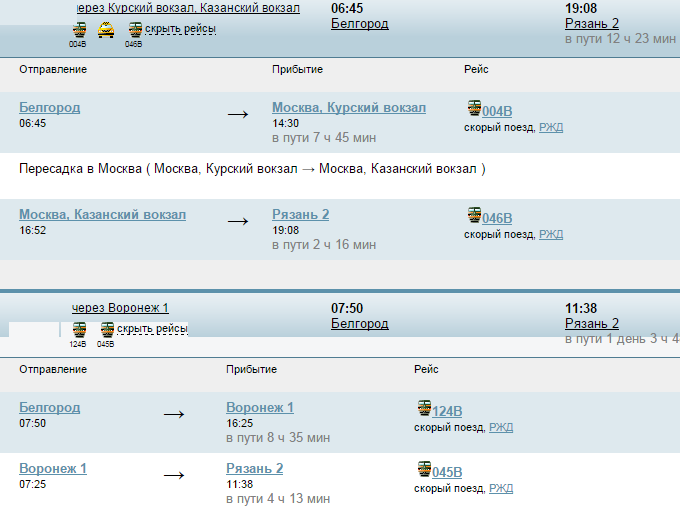 2. Белгород, отправление в 7:50 → прибытие в 16:25 в Воронеж 1.