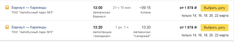 Билеты на автобус стоят соответственно 314 рублей (до Барнаула) и от 1578 рублей (до Астаны), провоз багажа 315 рублей. Итого поездка на автобусе обойдется от 1900 рублей.