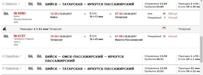 Несмотря на то, что вариант, мягко говоря, неудобный, я вам его оставлю, чтобы у вас был хоть какой-то выбор. Сразу говорю, что придется пересаживаться с поезда на поезд не один раз. Итак, главной точкой отправления в конечный пункт будет Иркутск, однако до него еще надо добраться, а сделать это можно, если взять билет до Омска или Татарской. В первом случае есть только один обеденный рейс в 13:30, но зато ежедневный. Второй вариант располагает двумя поездами и оба они тоже будут в 13:30, вроде бы и рейсы есть, но время совсем неудачное. По времени в любой пересадочный узел можно доехать за 18−20 часов. А вот до Иркутска дорога уже займет 1 день 15 часов.
