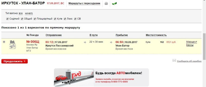 До Омска от 1812 и примерно столько же до Иркутска, а вот в Улан-Батор цена билета от 5 тысяч.