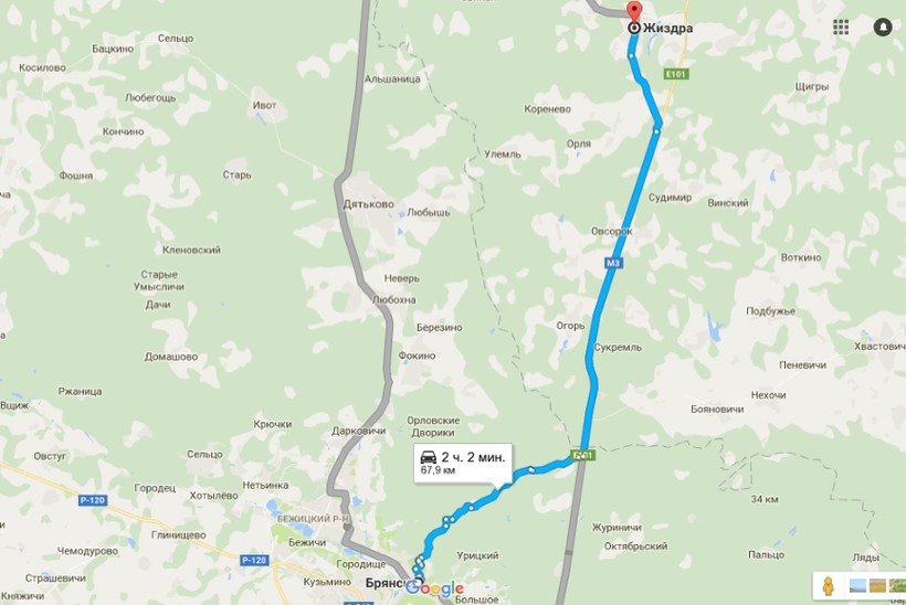 Второй путь из Брянска - ехать по трассе Р-120 до развилки и свернуть на Киевское шоссе (трасса М3/Е101) в сторону Калуги, далее двигаться по Киевскому шоссе до поворота на Жиздру. Расстояние между населенными пунктами составит почти 85 км, а время поездки в среднем 1 час с небольшим.