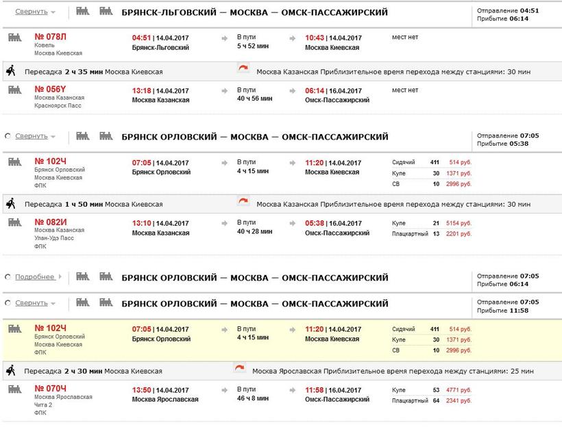 Брянск находится немного в стороне от транссибирских путей, так что приходится добираться через столицу. Небольшая сложность только в том, что надо перемещаться с одного вокзала на другой. Выискивая на сайте РЖД приемлемую пересадку, обращал внимание на время пересадки и перемещения с одного вокзала на другой.