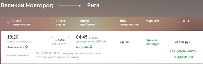 На автобус в Ригу билет можно купить только на автовокзале Великого Новгорода, сайта у него нет, но можно позвонить в справочную по телефону: +7 (8162) 77-61-86.