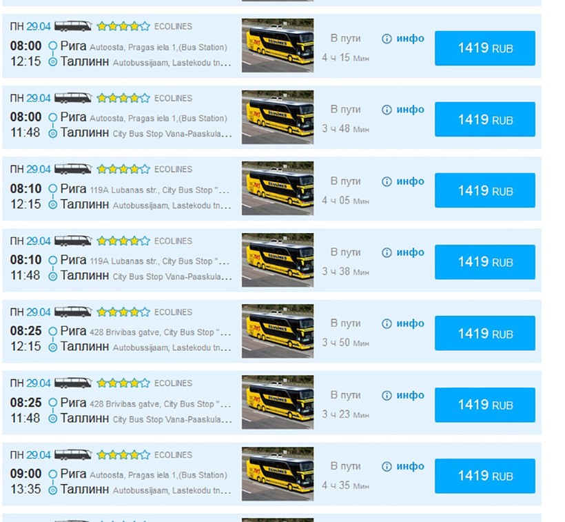 От Рижского автовокзала ежедневно идут автобусы в Таллин, перевозчик — Ecolines. Есть удобные рейсы в 8 и 9 часов утра, до Таллина автобус доезжает за 3,5–4 часа.