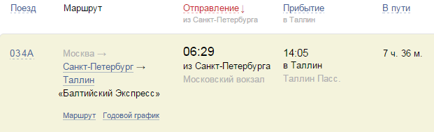 Из Санкт-Петербурга на Таллин курсирует один поезд, который отправляется с Московского железнодорожного вокзала в 06.29 и прибывает в 14.05 в эстонскую столицу. Регулярность отправок - каждый день.