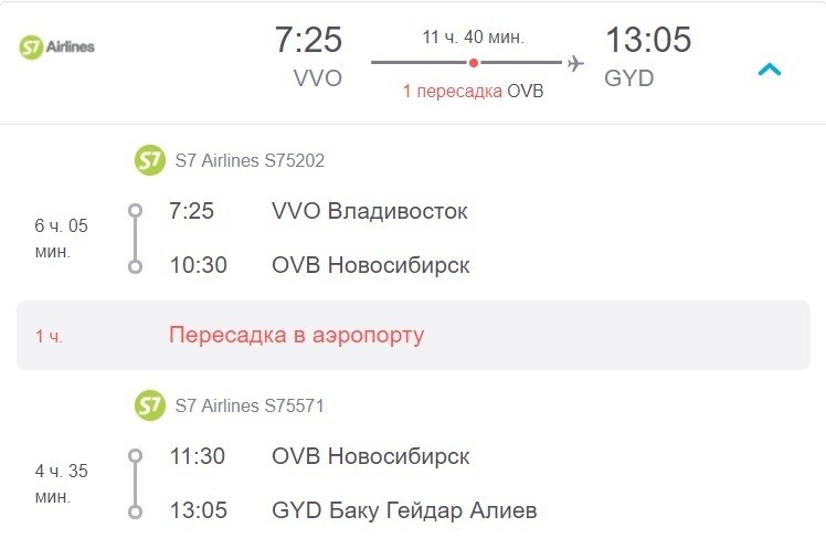 К сожалению, отсюда прямые рейсы до Баку не осуществляются. Нужно лететь с пересадкой. Ее сделайте, например, в Новосибирске. На дорогу уйдет примерно 12 часов. Оба рейса выполняет компания S7.