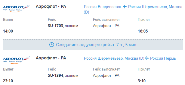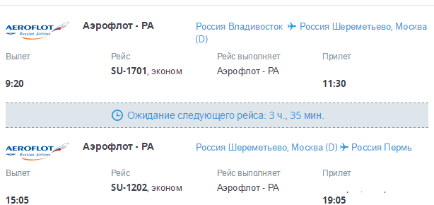 Есть много вариантов перелета из Владивостока через Москву в Пермь. Однако сейчас я представлю вам самые быстрые, которые обслуживает Аэрофлот: