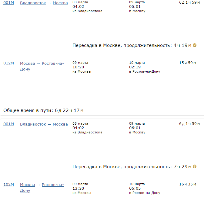 Если вы таки решили ехать на поезде, тогда лучше выезжать из Владивостока ночью - поездом 001М Владивосток → Москва, который отправляется с вокзала в 04.02. Ехать им стоит из-за того, что в столице удобно пересаживаться на один из поездов на Ростов-на-Дону.