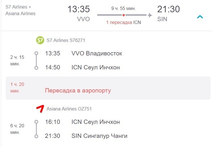 Прямые рейсы из данной воздушной гавани в Сингапур не осуществляются. Нужно лететь с пересадкой. Ее сделайте, например, в Сеуле. Вот один из вариантов.
