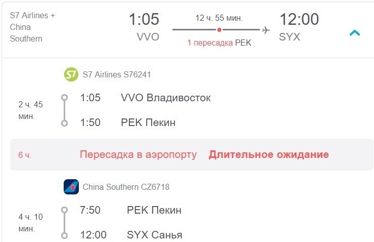 На дорогу уйдет тринадцать часов. Рейсы выполняют данные компании: S7 Airlines и China Southern.